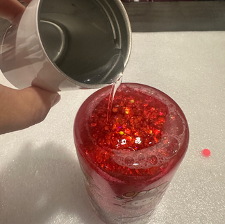Overfill the tumbler. Add your glitter and solution (distilled water and glycerin or a special snow globe solution) into the bottom of the tumbler. Continue filling until the solution beads up slightly over the hole.
